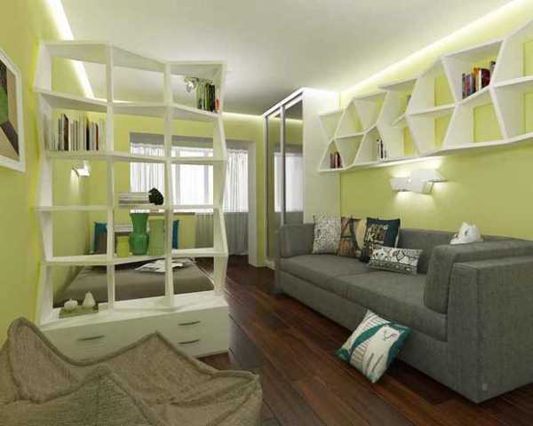 Нередко для зонирования используются стеллажи. Такая мебель в гостиной-спальне площадью 18 кв. м должна быть достаточно компактной. Нижние отделения используют в качестве шкафов и закрывают раздвижными фасадами, а верхние – как полки для книг, фотографий, живых цветов.