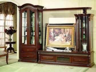 Как правило, подобные стенки делают на заказ из натурального дерева с использованием витражного стекла. Дизайн часто содержит инкрустацию. Это довольно тяжелая и дорогостоящая мебель из массива. Такие стенки очень большие, поэтому использовать их можно только в просторных гостиных.