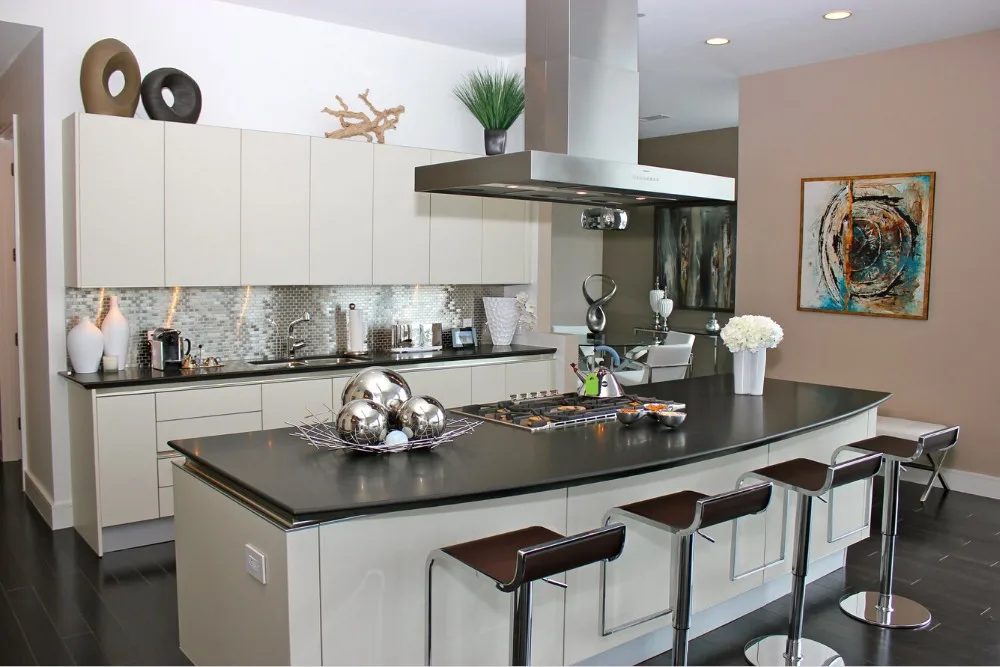 С матовым гарнитуром из массива или шпона. Столешница должна