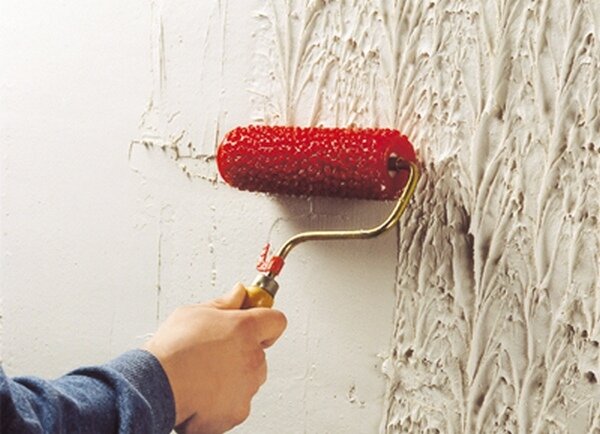 - Приготовленный раствор помещается на поверхность стены равномерно. Бороздки и рельефы на структурной поверхности следует тщательно прокрашивать, раскатывая валик.