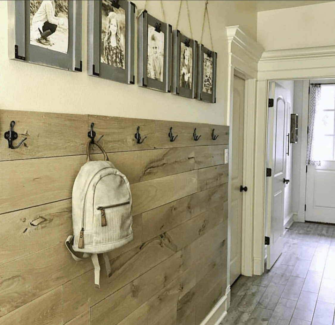В качестве материала для отделки стен довольно часто используется дерево, которое обладает невероятно красивой текстурой и делает прихожую особенно теплой, уютной.