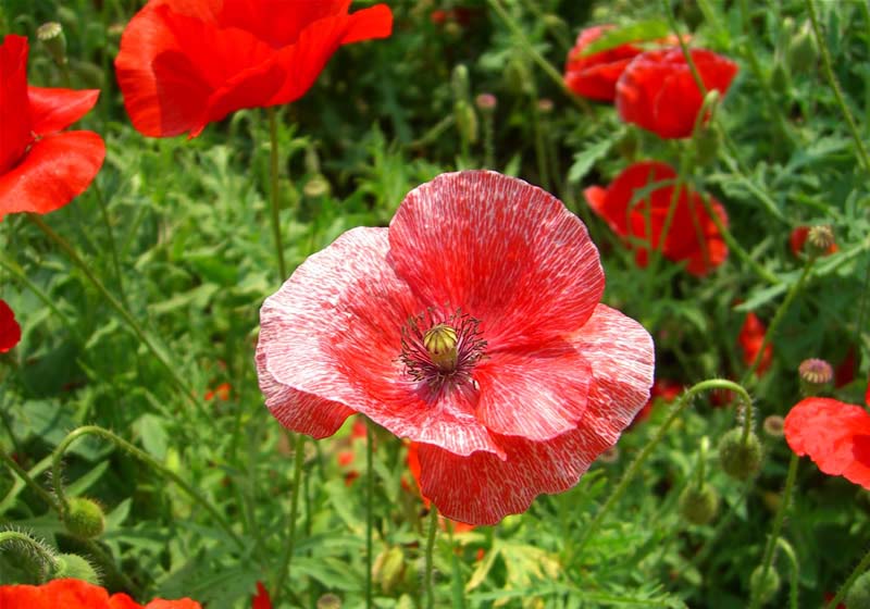 Мы привыкли к тому, как выглядит дикая форма этого цветка: алые, нежные лепестки с черным пятном у основания чашей окружают цветоложе.