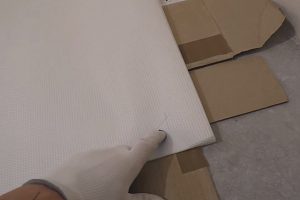 - Начните работу от угла плоскости. Это может быть потолок или стена. После приклеивания первой полосы рядом крепят вторую, и так все остальные. При этом образуют небольшой нахлест, который после окончательной фиксации надлежит подрезать.
