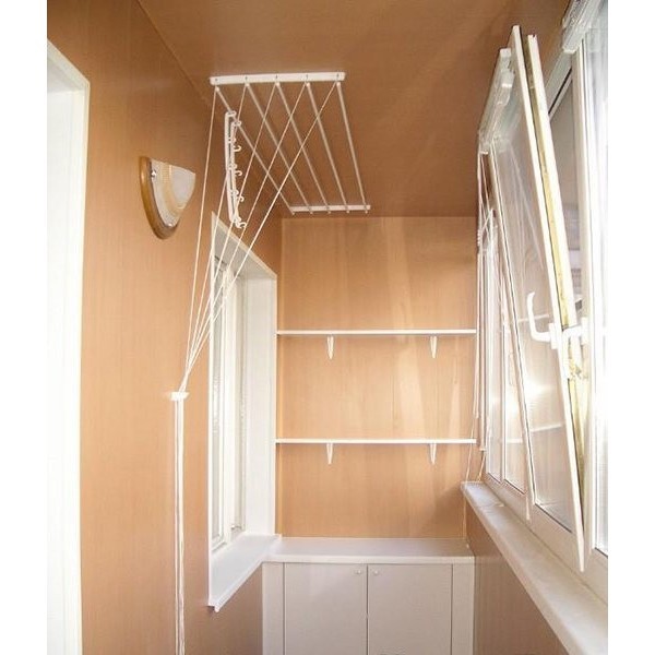 Сушилка на балконе потолочная используется в целях экономии пространства. С такой же целью устанавливается и сушилка для балкона настенная.